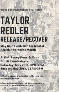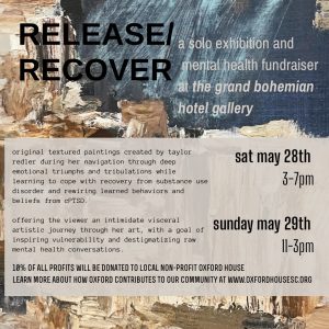 Oxford House is one of the only not-for-profit options for sober living in South Carolina. Ten-percent of all sales will be donated directly to the non-profit’s re-entry fund which will aid those without funding get into houses by paying their first week’s rent. Oxford House’s rent does not exceed $500 a person and includes rent, utilities, and basic house needs like toilet paper, paper towels, etc. The Grand Bohemian Gallery will be matching Redler’s donations. You can learn more about Oxford House here.