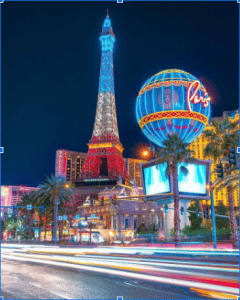 This French-themed casino hotel is just across from the Bellagio and features a half-sized Eiffel Tower out front. It is 9 minutes from a Monorail station, so it’s easy to get to.