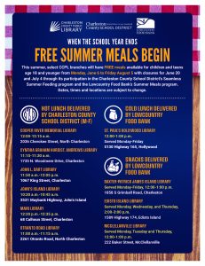 The Charleston County Public Library (CCPL), Charleston County School District (CCSD), and the Lowcountry Food Bank (LFB) have teamed up to provide free meals and snacks at several library branches for kids this summer break. The Summer Feeding program begins on Monday, June 6th and runs through August 5th.