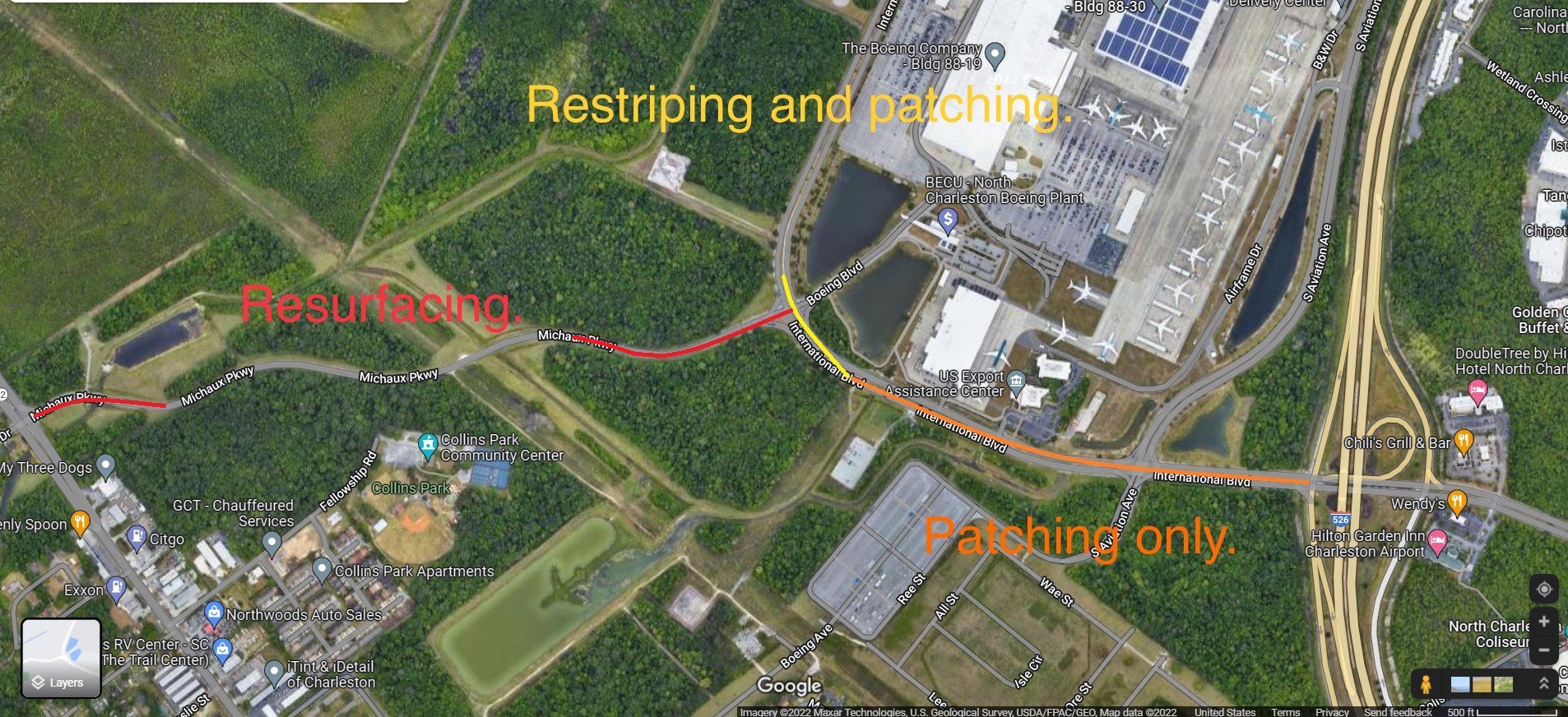 Nighttime lane closures for resurfacing work are scheduled on Michaux Parkway and International Boulevard from 7 pm to 6 am beginning Thursday, June 9th.