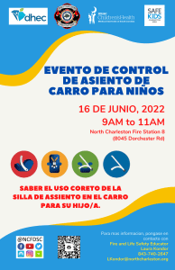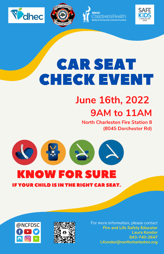 To learn more about this event, contact Fire and Life Safety Educator, Laura Kondor, of North Charleston Fire Department, at (843) 740-2647 or e-mail: LKondor@northcharleston.org. Technicians will conduct car seat checks at this event on a first come, first serve basis.