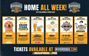 Below is a list of all of the fun the RiverDogs have planned for this week Tuesday-Sunday: