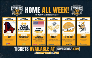 The Charleston RiverDogs return home to battle the August GreenJackets in a six-game series that begins with a gigantic Independence Day celebration and continues through Sunday evening. As opposed to the typical homestand, this one begins on Monday, July 4th, followed by an off day Tuesday and five more fun-filled games Wednesday-Sunday.