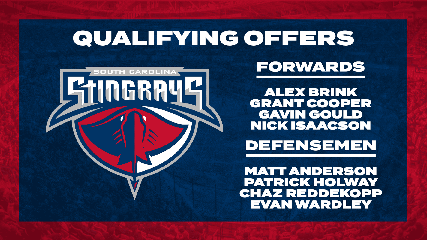 The South Carolina Stingrays, proud ECHL affiliate of the NHL’s Washington Capitals and AHL’s Hershey Bears, announced that qualifying offers have been extended to eight players on their 2021-22 season-ending roster.