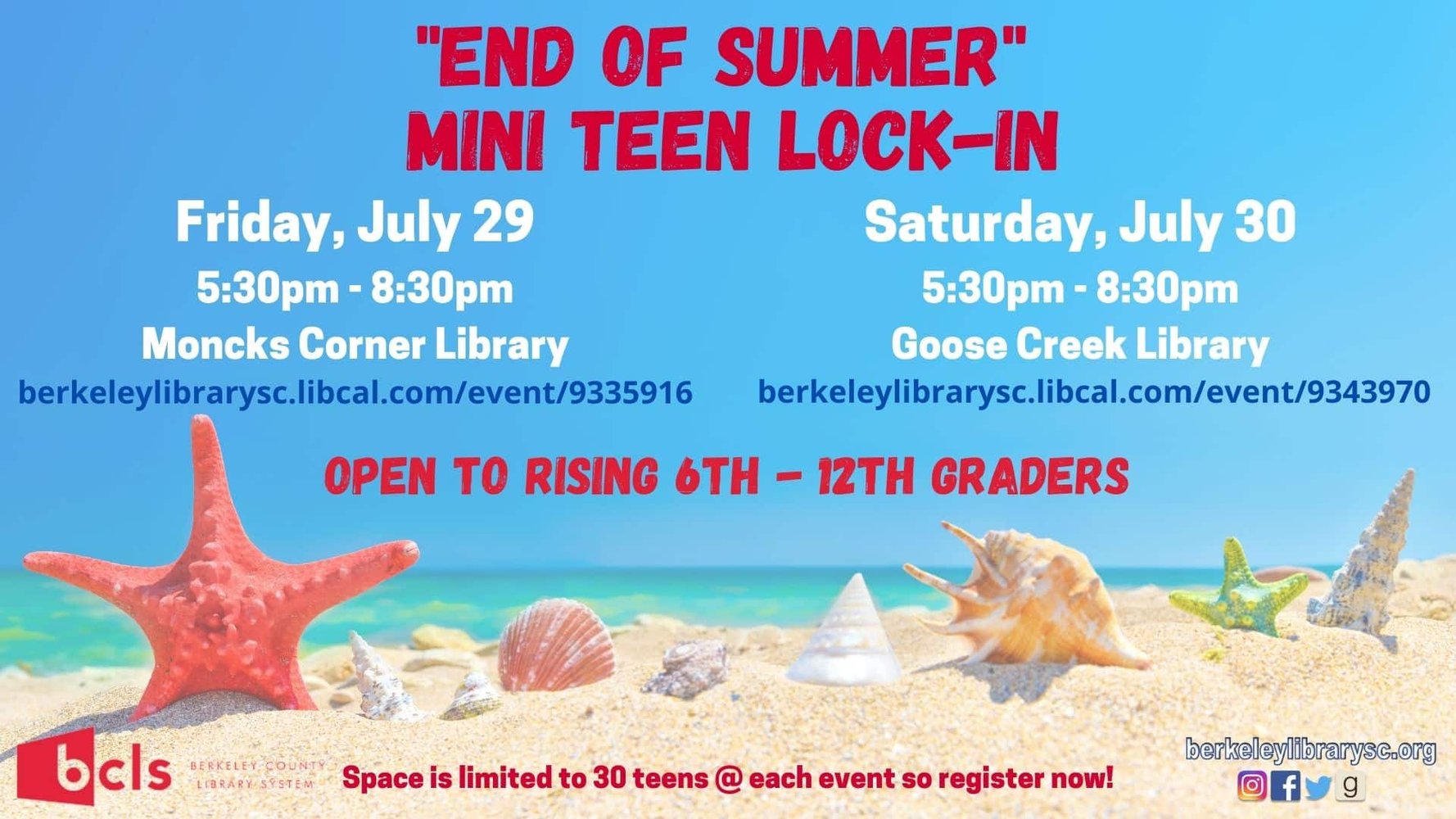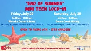 Berkeley County Library System (BCLS) will host its End of Summer Mini Lock-In for rising sixth-twelfth grade students (ages 12-18) on Friday, July 29th, at Moncks Corner Library, and Saturday, July 30th, at Goose Creek Library from 5:30 pm to 8:30 pm. A lock-in is a program where teens are “locked in” the library until the end of the event. If an emergency at either location or both occurs before the end of each event, the doors will be opened.