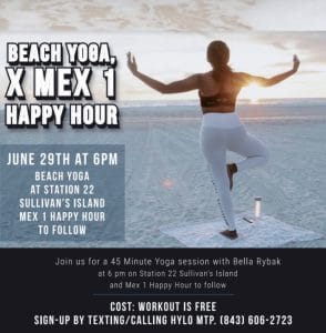 The class will be held at Station 22 on Sullivan’s Island followed by happy hour at Mex 1 Sullivan’s Island. The workout is free to attend. To sign up for the class, call or text HYLO Mount Pleasant at (843)-606-2723.