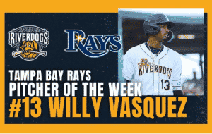 Charleston RiverDogs infielder Willy Vasquez has been named the Carolina League Player of the Week for the week of July 4-10, Minor League Baseball announced on Monday afternoon. Vasquez is the first RiverDogs position player to receive a weekly honor during the 2022 season. Austin Vernon was previously named Pitcher of the Week in May.