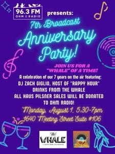From 5:30 pm to 7 pm, The Whale will host a free, outdoor celebration that will include a live broadcast of “Rappy Hour,” hosted by local DJ Zach Giglio, and plenty of beverages available for purchase. Guests will also get the chance to tour the new Ohm Radio studio and make a local promo that will air on the station. Plus, The Whale will donate all Haus Pilsner sales to Ohm Radio.