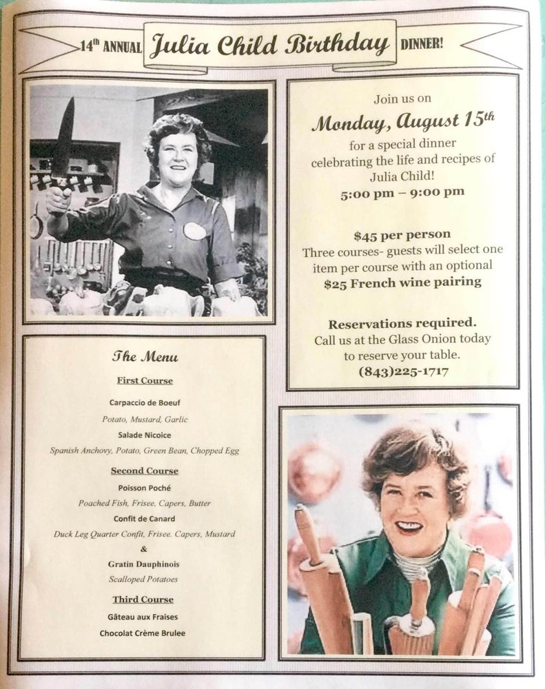 On Monday, August 15th, The Glass Onion restaurant will once again celebrate Julia Child’s birthday with a special menu featuring some of her recipes. The restaurant’s 14th Annual Julia Child Birthday Dinner will run from 5 pm to 9 pm and reservations are required.