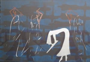 In her exhibition, Mary Walker presents several series of dance monoprints. Walker has been interested and involved in dance since childhood – taking classes, designing costumes, making posters, and sketching during rehearsals. The prints featured in her exhibition came from the artist’s desire to express the musicality, movement, and emotion of a dance piece. “I was inspired by the emotion and drama expressed through the movement in choreography by Jose Limon, Mats Ek, Akram Khan, Pina Bausch, and Kristin Alexander,” Walker explains. After watching the rehearsals and videos of these choreographers, she would sketch. Then, using her sketches as a guide, she cut stencils or carved woodcuts to make monotypes. There are at least four to five prints in each series to help give the effect of movement and time.