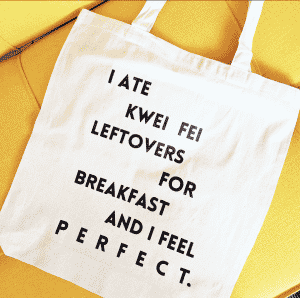 The cotton tote (right), which reads “I ate Kwei Fei Leftovers for Breakfast and I Feel Perfect,” can be purchased at KweiFei.com, at the restaurant (1977 Maybank Highway on James Island), or at the Portal tent at Saturday’s Pickers Hullabaloo Flea Market at Firefly Distillery.