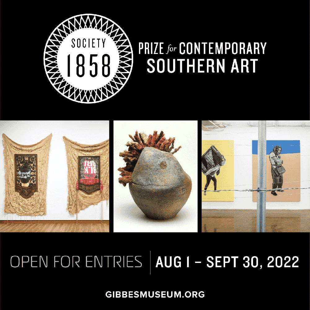 The Gibbes Museum of Art is pleased to announce the 2022 1858 Prize for Contemporary Southern Art. Each year, Society 1858, the museum’s young professionals auxiliary group, awards a $10,000 cash prize to one artist whose work demonstrates the highest level of artistic achievement in any media, while contributing to a new understanding of art in the South. Past winners include Stephanie J. Woods (2021), Stephen L. Hayes (2020), Donté K. Hayes (2019), Leo Twiggs (2018), Bo Bartlett (2017), Alicia Henry (2016), Deborah Luster (2015), Sonya Clark (2014), John Westmark (2012), Patrick Dougherty (2011) and Radcliffe Bailey (2010). Submissions for 2022 will be accepted online at www.1858prize.org from Aug. 1 – Sept. 30, 2022.