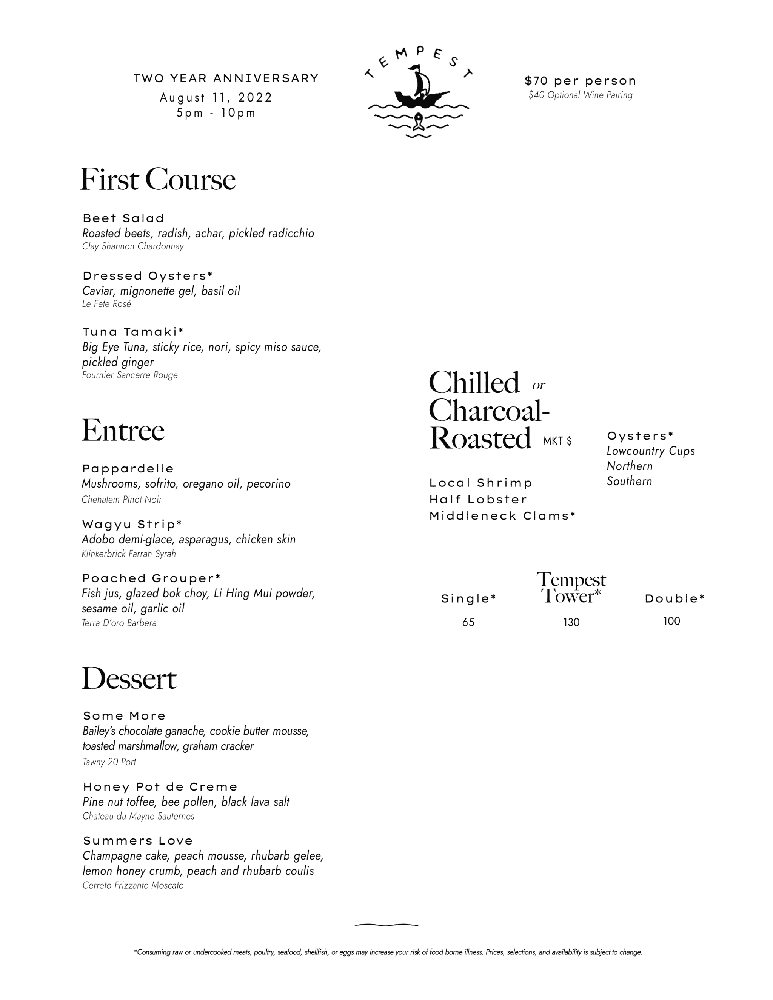 For more information on Tempest or to book a reservation for the anniversary dinner, visit www.tempestcharleston.com.