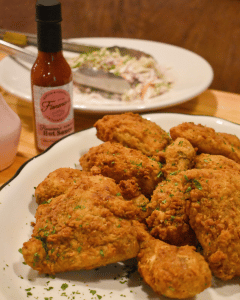 The restaurant’s Back-to-School Bucket, complete with nine pieces of crispy fried chicken and a bottle of their housemade hot sauce (right), is now available for $20. Southern sides like collards, pimento cheese grits, and Charleston red rice are available à la carte for an additional cost.