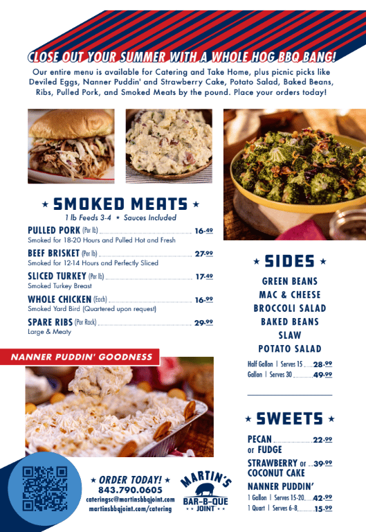 The catering menu includes smoked meats, sides, and desserts. Orders can be placed online at www.martinsbbqjoint.com/