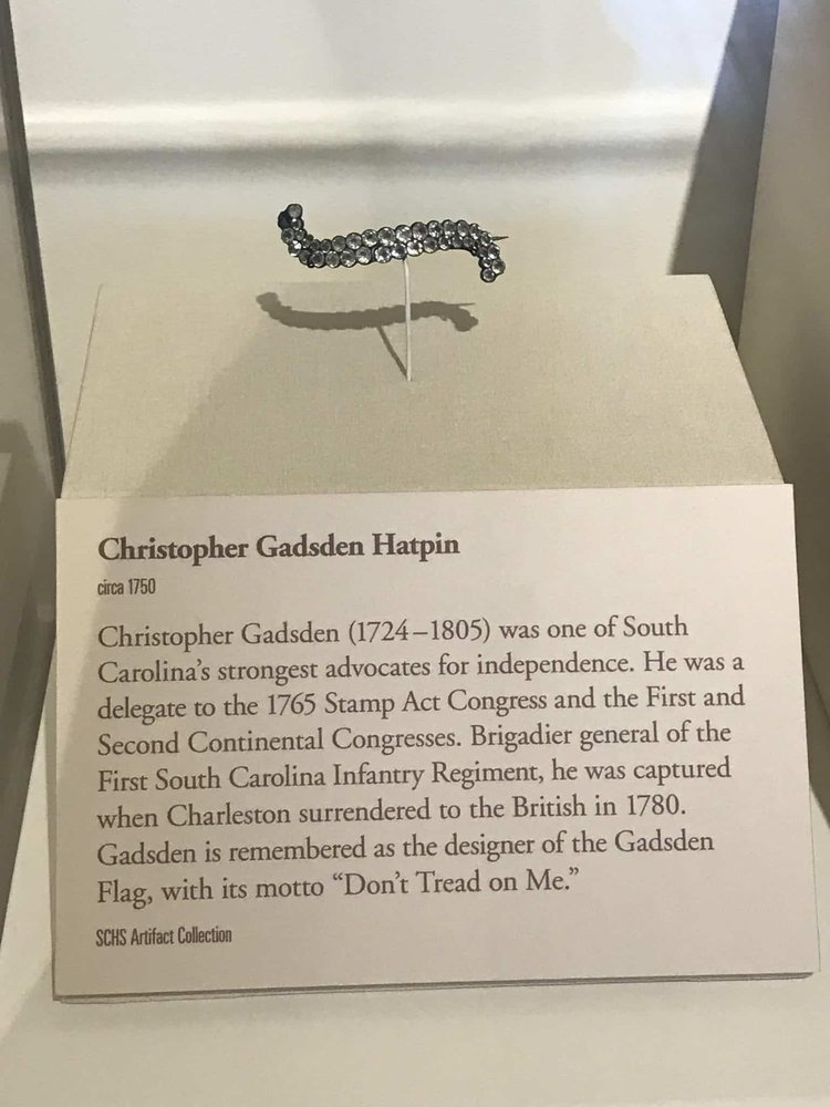 This hatpin was a gift from Christopher Gadsden to his daughter. It is currently on display in the SCHS Museum in Charleston