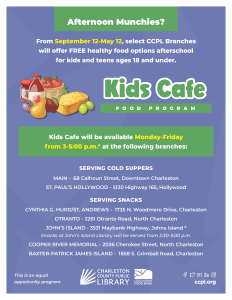 “We are thrilled to now offer cold suppers at two branches in additions to healthy snacks at five others to help kids and teens find a consistent source of food after school,” said Kathleen Montgomery, CCPL Associate Director, Community Engagement. “We are so grateful to our partners at the Lowcountry Food Bank for making this program possible!”