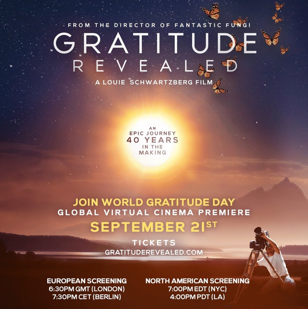 An epic journey forty years in the making, Gratitude Revealed from acclaimed filmmaker, Louie Schwartzberg, the director of cult hit Fantastic Fungi, takes us on a transformational, cinematic experience of how to live a more meaningful life full of Gratitude through his intimate conversations with everyday people, thought leaders, and personalities revealing Gratitude is a proven pathway back from the disconnection we feel in our lives; disconnection from ourselves, our planet, and each other.