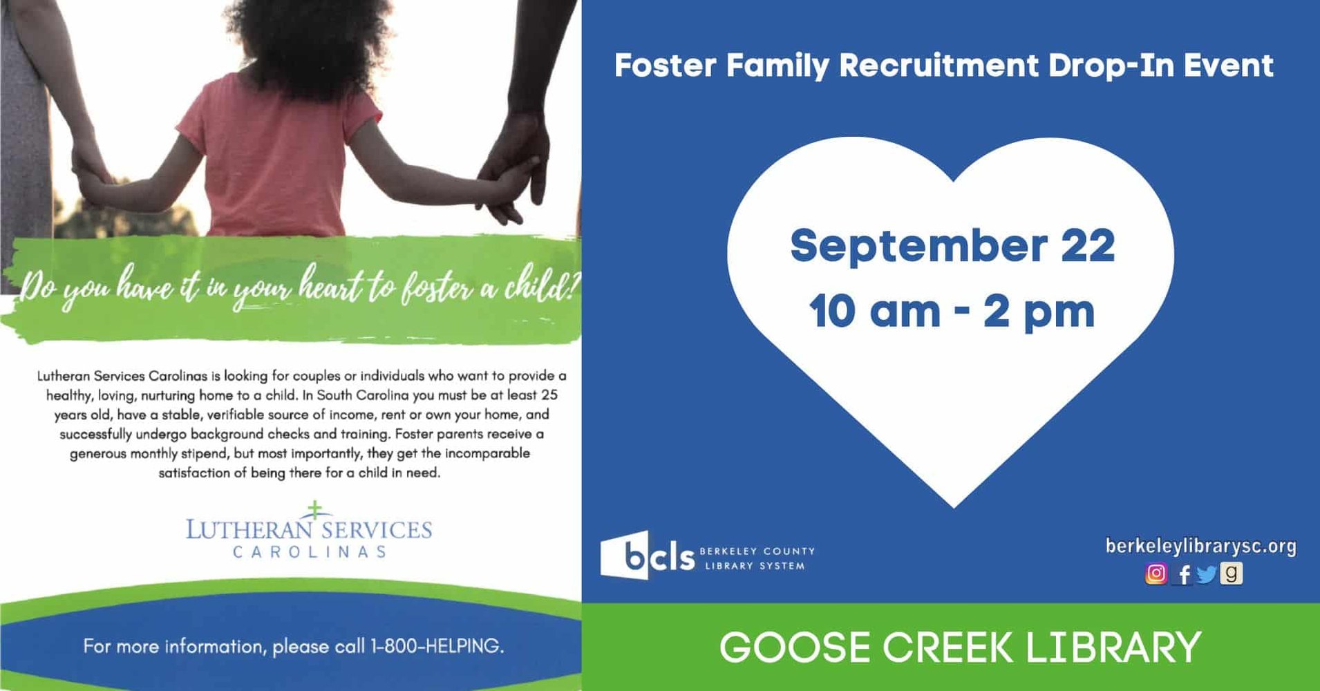 Berkeley County Library System (BCLS), in collaboration with Lutheran Services Carolinas, invites customers to participate in Foster Family Recruitment Drop-In Event on Thursday, September 22, 2022 from 10 am – 2 pm to learn more about fostering from Robbie Dent, Foster Family Recruiter.