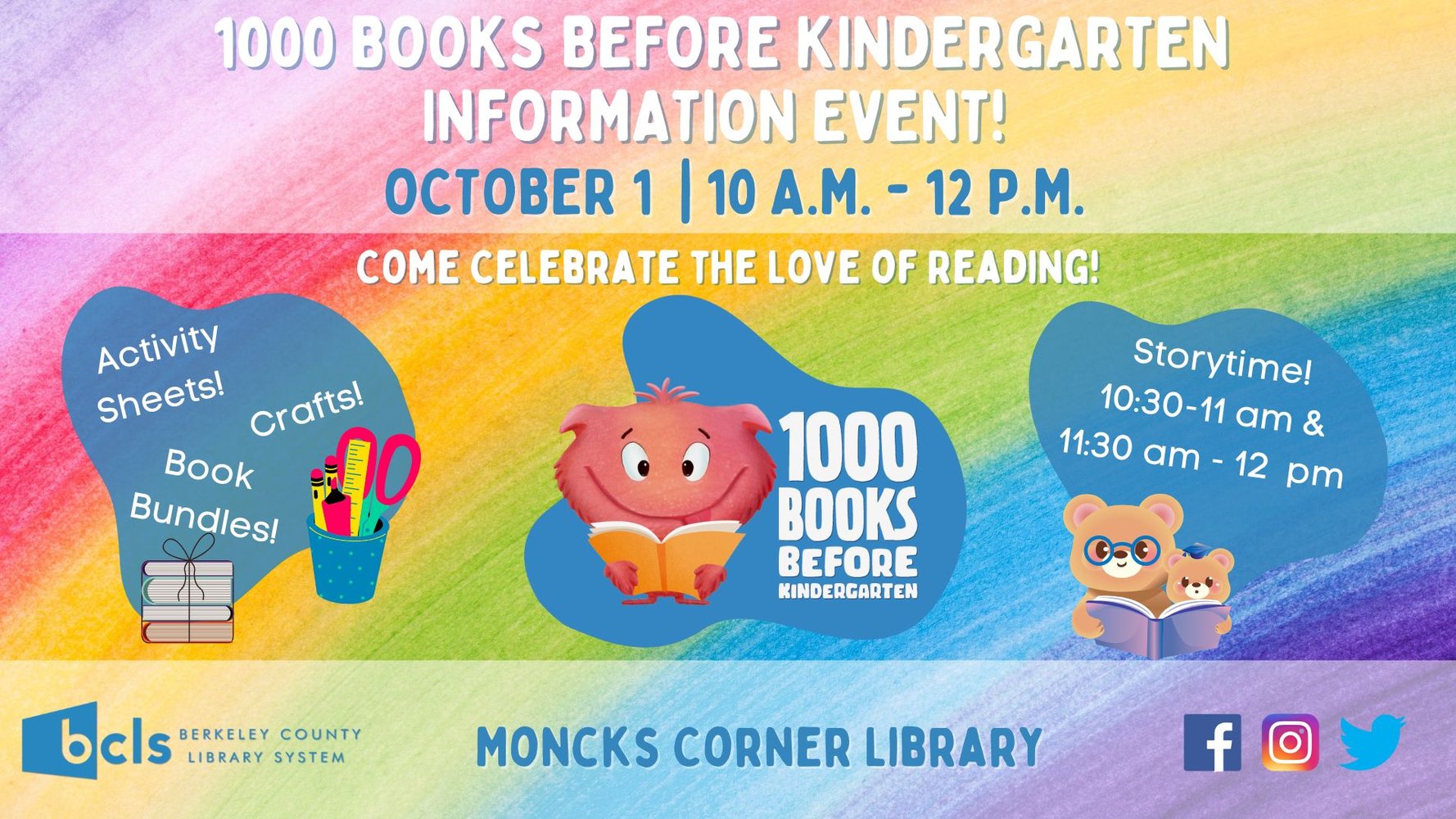 Berkeley County Library System, (BCLS) welcomes interested library users to attend the 1000 Books Before Kindergarten Information Event on Saturday, October 1, 2022, from 10 am – 12 pm at the Moncks Corner Library, located 1003 N. Highway 52 in Moncks Corner. Participants will have children’s crafts, Storytime (10:30-11 a.m. and 11:30-12 p.m.) and Activity Sheets available in addition to 1000 Books Before Kindergarten Book Bundles for checkout!