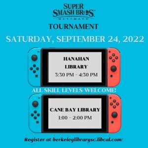 The featured video game is Super Smash Bros. Ultimate played on the Nintendo Switch on September 24th at both the Hanahan and Cane Bay Libraries. The Super Smash Bros. Tournament Style is 1 vs. 1 elimination rounds. See the links below to register. The tournaments are for all ages and skill levels.