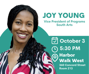 The College of Charleston Arts Management Program announces a new multidisciplinary speaker series, ARTM Exchange, featuring conversations between artists and arts leaders and faculty, staff, students, and the community. The series launches with a discussion exploring the unique aspects of advancing and managing the arts in the South led by Joy Young, Vice President of Programs for South Arts, on Monday, October 3rd at 5:30 pm at Harbor Walk West, 360 Concord St., Room 213. ARTM Exchange events are free and open to the public. Learn more about the series here.