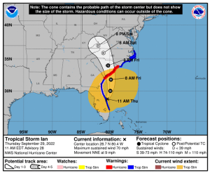 Citizens are encouraged to begin making preparations now. The city’s Hurricane Information webpage can be accessed at https://www.charleston-sc.gov/974/Hurricane-Information. Updates on Hurricane Ian will be released and posted to the webpage as new information becomes available.