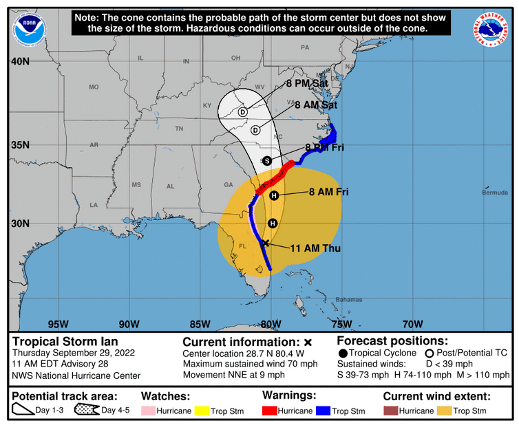 Tropical Storm Ian is projected to make landfall near the South Carolina/ Georgia border on Friday with 70 mph sustained winds, according to the National Weather Service.