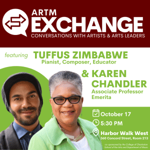 The event on Monday, October 17 (5:30 p.m. at Harbor Walk West, 360 Concord St., room 213), also includes Zimbabwe’s performance of piano compositions by Edmund Thornton Jenkins. ARTM Exchange events are free and open to students, faculty, staff, and the community. Learn more about the series, including livestream information, here. This event is co-sponsored by the College of Charleston School of the Arts and the College’s Department of Music.