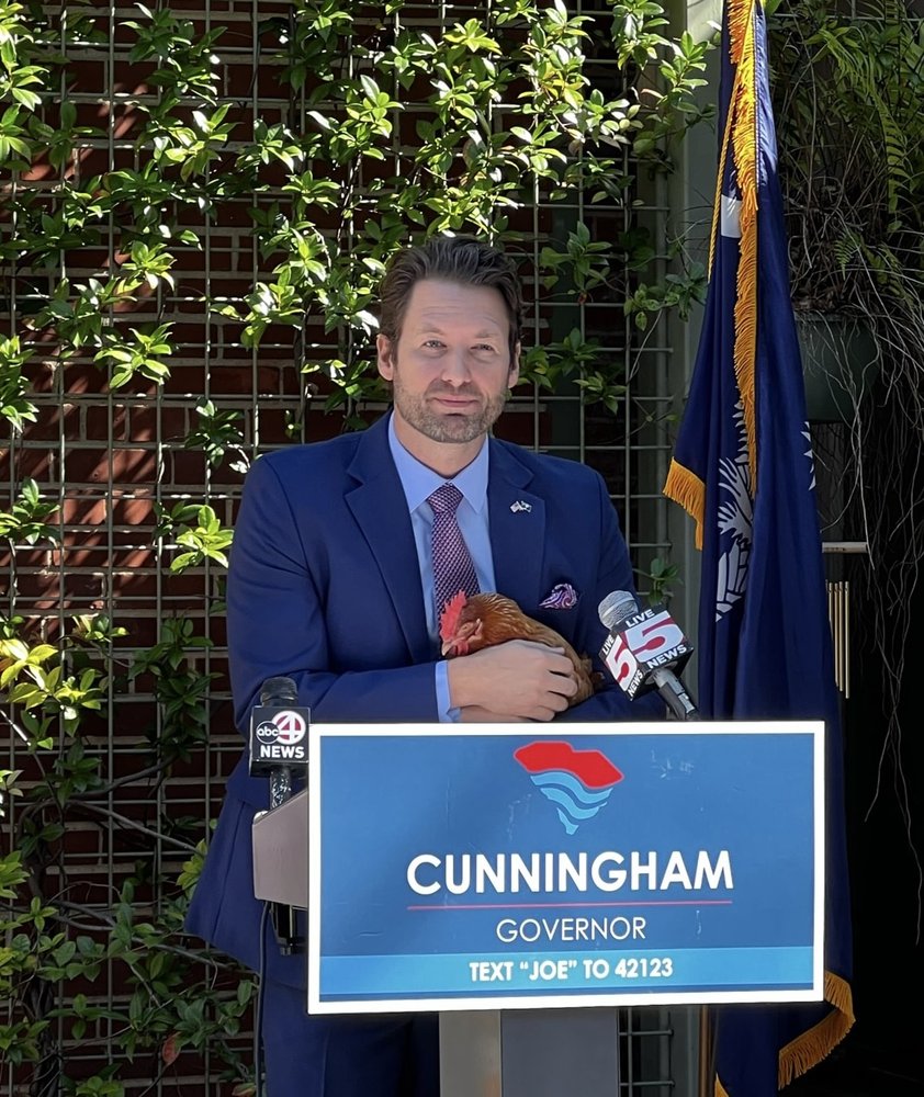 Joe Cunningham Calls Out Governor for “Ducking Debates” While Holding a Chicken He Named “Henrietta McMaster”