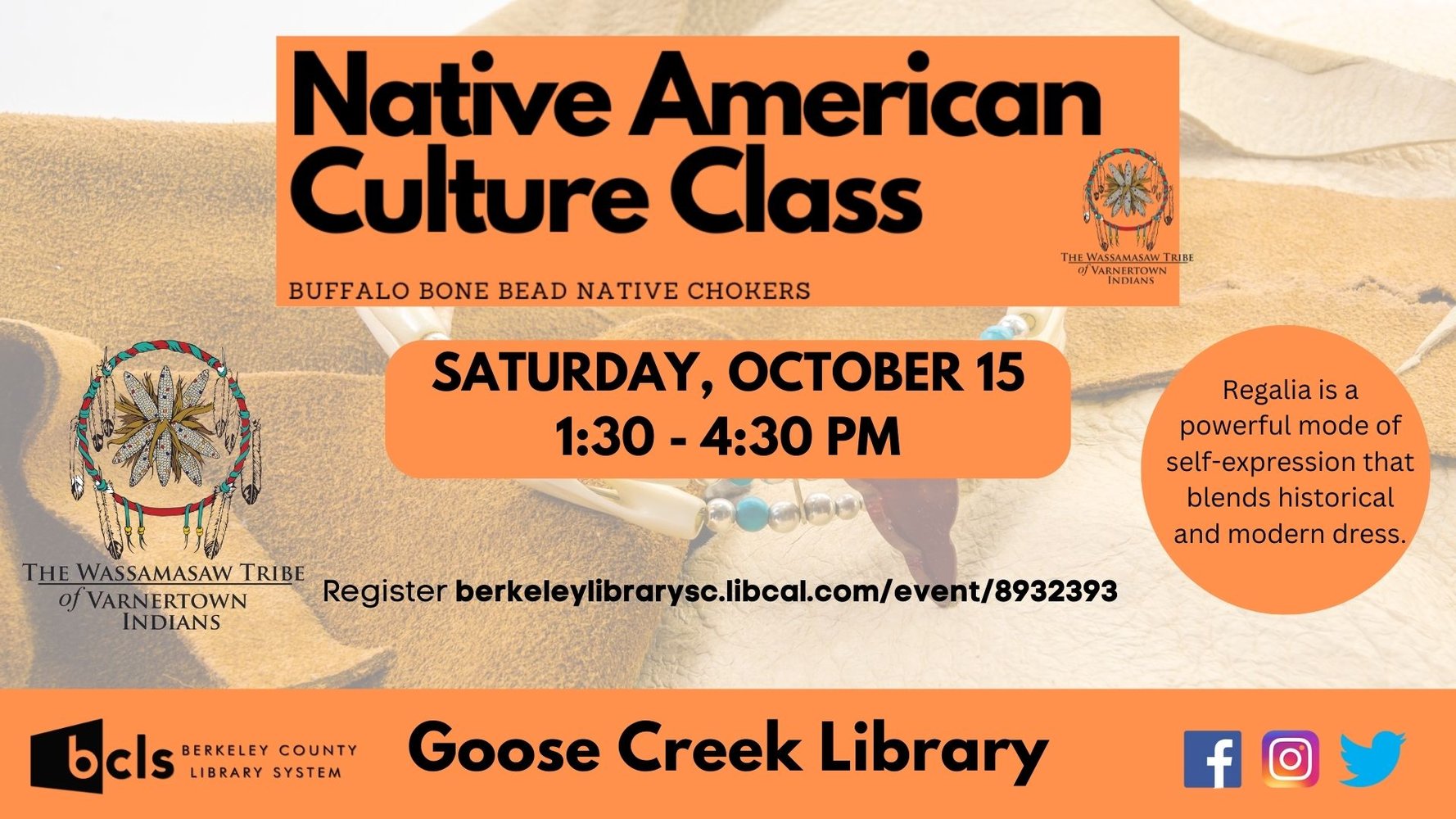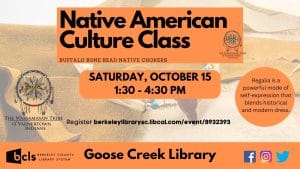 Berkeley County Library System (BCLS) continues to collaborate with the Wassamasaw Tribe of Varnertown Indians, a State Recognized Tribe, to co-host the continuing series, Native American Culture Class. The next class, Buffalo Bone Bead Native Chokers, will be on Saturday, October 15th, from 1:30 pm to 4:30 pm at Goose Creek Library. All supplies provided.