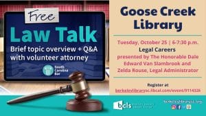 Berkeley County Library System (BCLS), in collaboration with the South Carolina Bar, invites customers to participate in Law Talk Series, Tuesday, October 25th, 2022, from 6 pm to 7:30 pm at Goose Creek Library. The discussion topic is Legal Careers by The Honorable Dale Edward Van Slambrook and Zelda Rouse, Legal Administrator, Steinberg Law Firm, LLC.