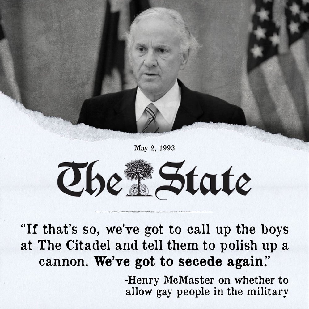 Governor McMaster has a long history of bigoted statements about the LGBTQ community and opposition to marriage equality. In response to President Clinton overturning the ban on LGBTQ military members in 1993, McMaster publicly supported secession.