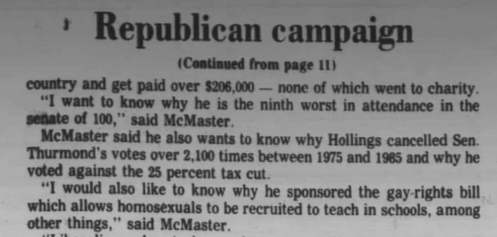 “I want to know why he sponsored the the gay-rights bill that allows homosexuals to be recruited to teach in schools, among other things,” McMaster said at the time.
