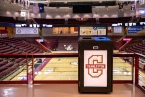 When the College of Charleston men’s basketball team takes the court against Chattanooga at TD Arena for their first home game of the season on Nov. 7, 2022, fans will be able to score a few points of their own for sustainability. Thanks to graduate student Nicole Killen and her thesis project about recycling behavior within TD Arena, there will be $30,000 worth of new CofC branded recycling and trash receptacles throughout the facility – 17 total.