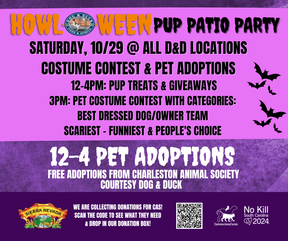 The Halloween themed pup party will have a costume contest with prizes for scariest costume, funniest costume, people’s choice, and best dog/owner costume. Owners are encouraged to bring their furry best friend and if they don’t have one, the Charleston Animal Society will be on-site with adoptable pups that have had their adoption fees covered by Dog & Duck.