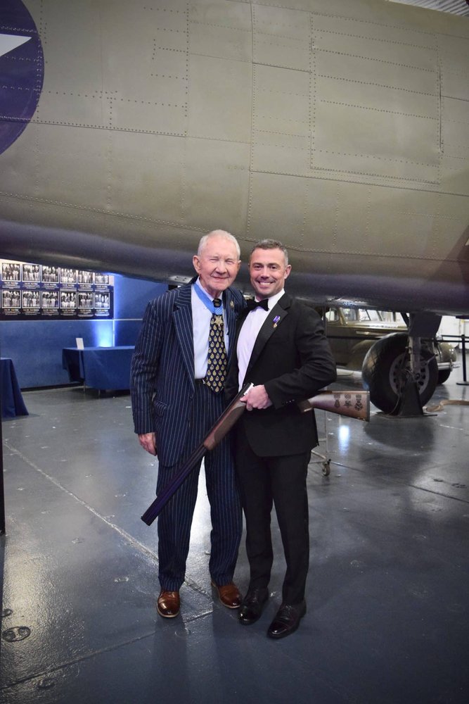 A highlight of the event was the auction of a shotgun engraved with Major General James Livingston’s signature. The winning bidder, Captain Philip Palmer, plans to gift the shotgun to his grandfather, who served with General Livingston in Vietnam. Captain Palmer had his own personal connection with General Livingston when he served as his aide for the day after receiving his own Purple Heart. Captain Palmer said, “It is an honor to gift him this family legacy piece.”