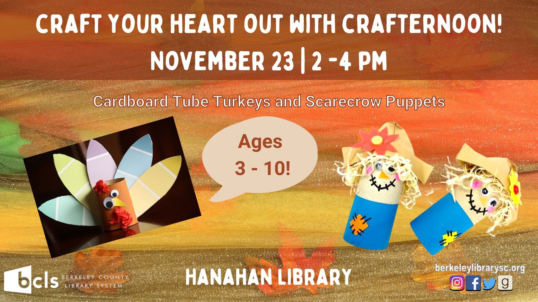 Berkeley County Library System (BCLS) invites ages 3–10 to create and craft Cardboard Tube Turkeys and Scarecrow Puppets on Wednesday, November 23rd, 2022 from 2 pm to 4 pm. The event will take place at the Hanahan Library, located at 1216 Old Murray Court, Hanahan.