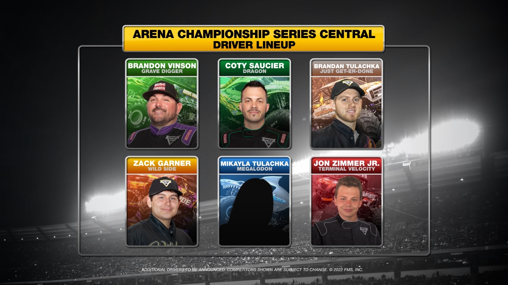 TRUCK LINEUP: Grave Digger driven by Brandon Vinson; Dragon driven by Coty Saucier; Just Get-Er-Done driven by Brandan Tulachka; Wild Side driven by Zack Garner; Megalodon driven by Mikayla Tulachka; Terminal Velocity driven by Jon Zimmer Jr.; 2 trucks/drivers TBA
