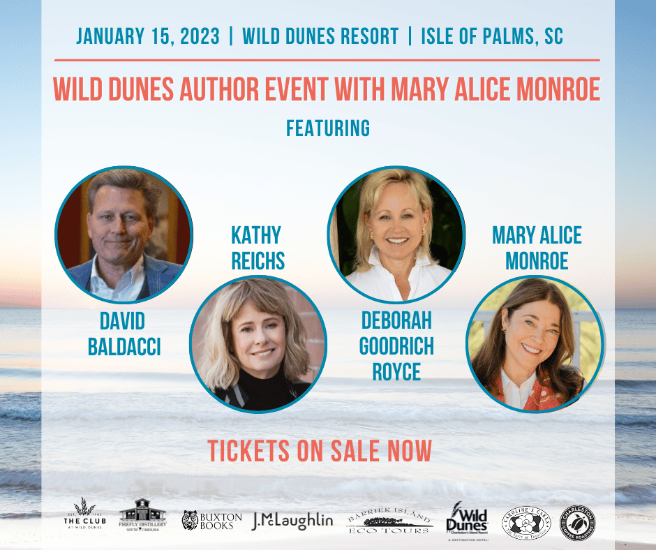 Tickets are on sale now for the 19th Annual Wild Dunes Author Event with Mary Alice Monroe, happening January 15th, 2023 at Wild Dunes Resort on the Isle of Palms. This year’s event features an all-star line-up of bestselling mystery and thriller writers– David Baldacci, Kathy Reichs, and Deborah Goodrich Royce. Tickets can be purchased here.
