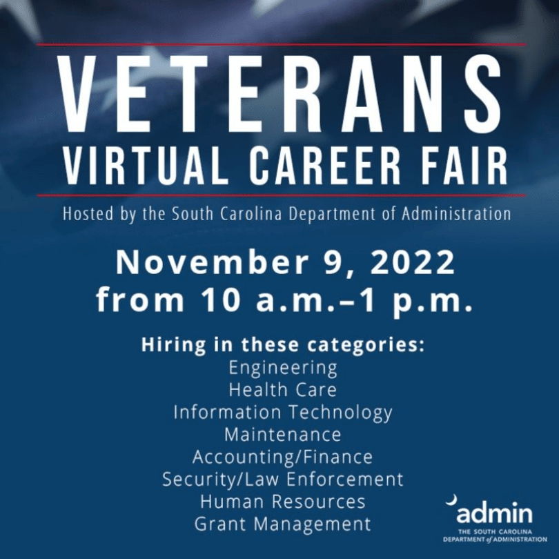 Governor Henry McMaster, the South Carolina Department of Administration (Admin), and the South Carolina Department of Veterans’ Affairs (SCDVA) encourage all South Carolina Veterans looking to continue a career of service to take part in the Veterans Virtual Career Fair happening on November 9th, 2022.