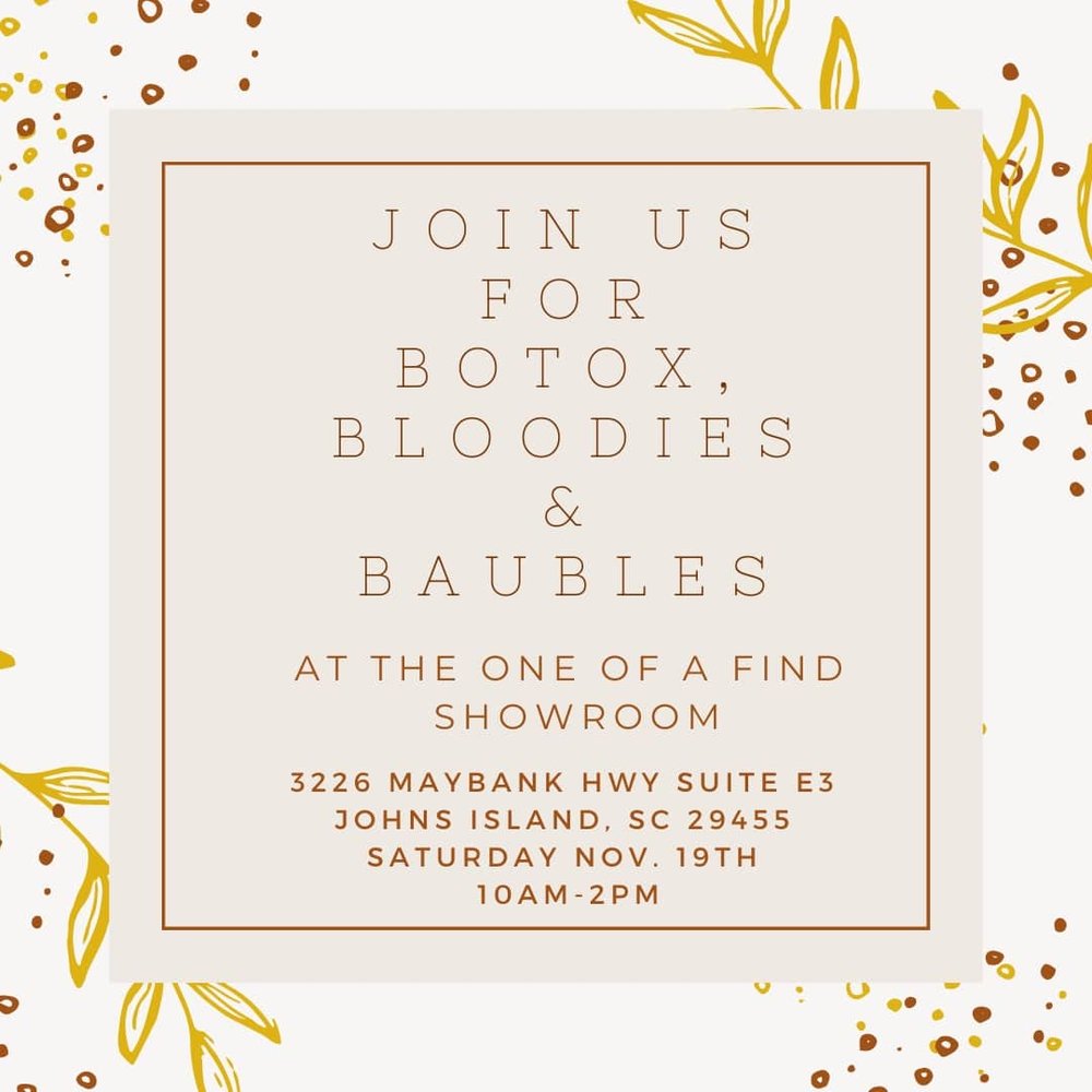 Attendees can get botox from Lila Dené Aesthetics while sipping on Natural Blonde Bloody Mary Mix and shop women’s accessories by Lesetta and unique vintage furniture pieces and décor by One of a Find Charleston.