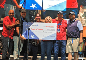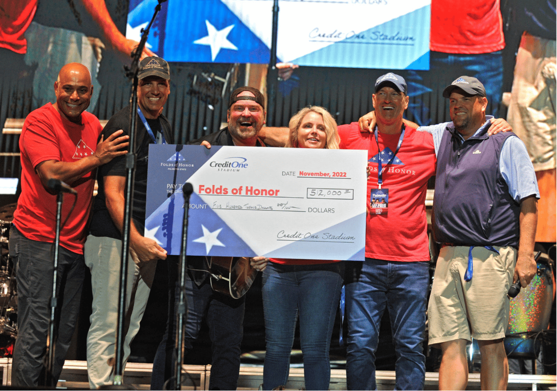 From Left-Right: Luke Sherman, Folds of Honor; Jeff Morris, Folds of Honor; Lee Brice; Jenn Stephens, Folds of Honor recipient family; Eric Timko, Folds of Honor; Bob Moran, Credit One Stadium