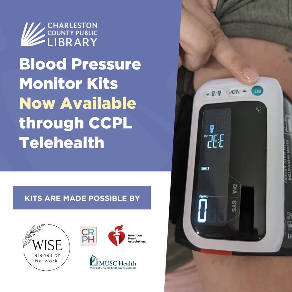Blood Pressure Kits can be checked out with a Charleston County Library card. The kits contain a blood pressure cuff, instructions, tracking information, and literature about managing blood pressure. The library patrons will have the opportunity to receive blood pressure monitoring education with a Community Health Worker who is employed by CCPL. In addition, the CCPL currently offers a telehealth program targeting women in rural areas as well as diabetes prevention classes for patrons.