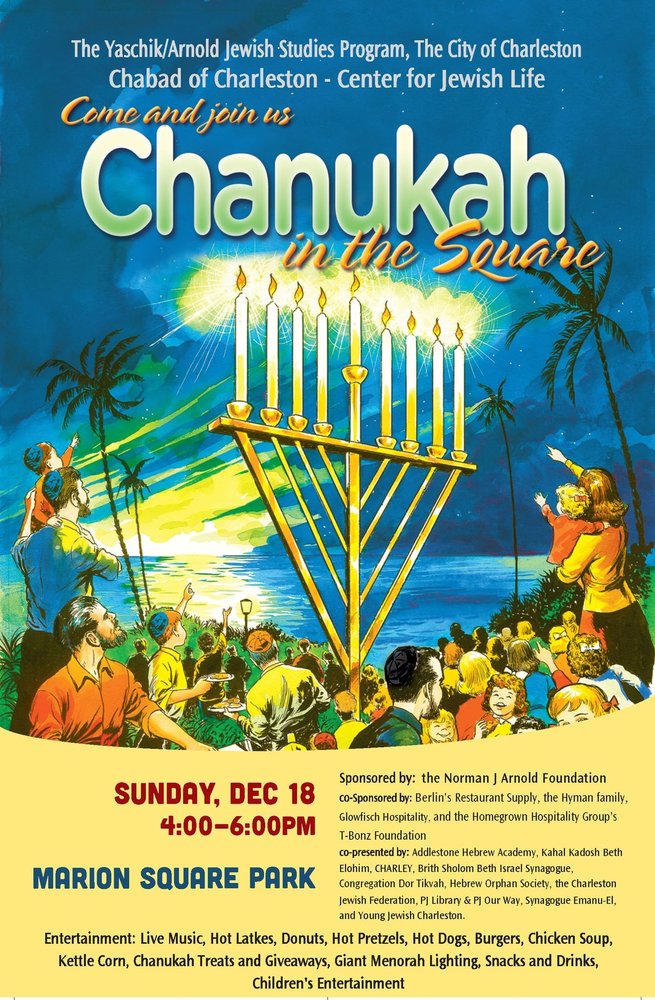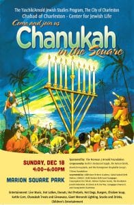 The College of Charleston Yaschik/Arnold Jewish Studies Program and Chabad of Charleston – Center for Jewish Life have partnered with the City of Charleston’s Office of Cultural Affairs and many other community organizations to host the largest annual Jewish event in the state of South Carolina. Chanukah in the Square is a great way to come together as a community.