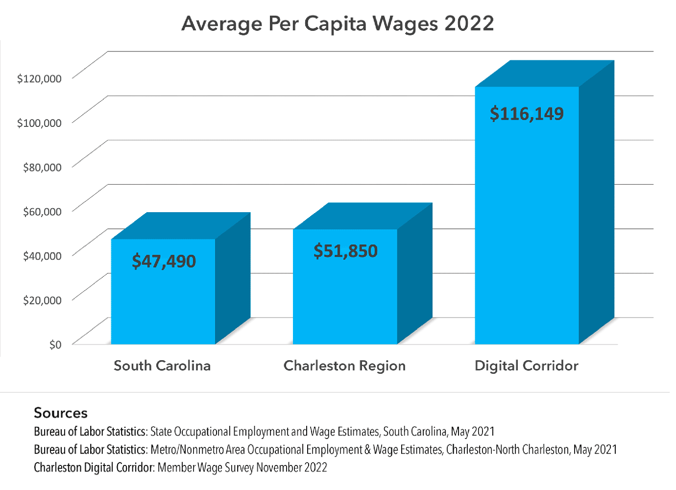 The Charleston Digital Corridor today released its 2022 Wage Survey along with a graph of the information (right). The average per-capita wage at companies participating in the 2022 survey is $116,149 – the largest year-over-year growth in average wages since the CDC started surveying its members in 2003. This number once again represents more than twice the State of South Carolina’s average wage of $47,490 and Charleston Region average wage of $51,850 according to the latest (May 2021) data available from the US Bureau of Labor Statistics.