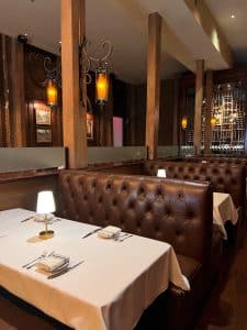 Oversized booths are perfect for an intimate dining experience, and the inviting ambiance of the dining room is enhanced by a baby grand piano, with a live pianist on select evenings.”