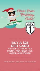Customers will receive a Mex 1 pint glass, koozie, and sticker with the purchase of a $25 gift card at any Mex 1 location: