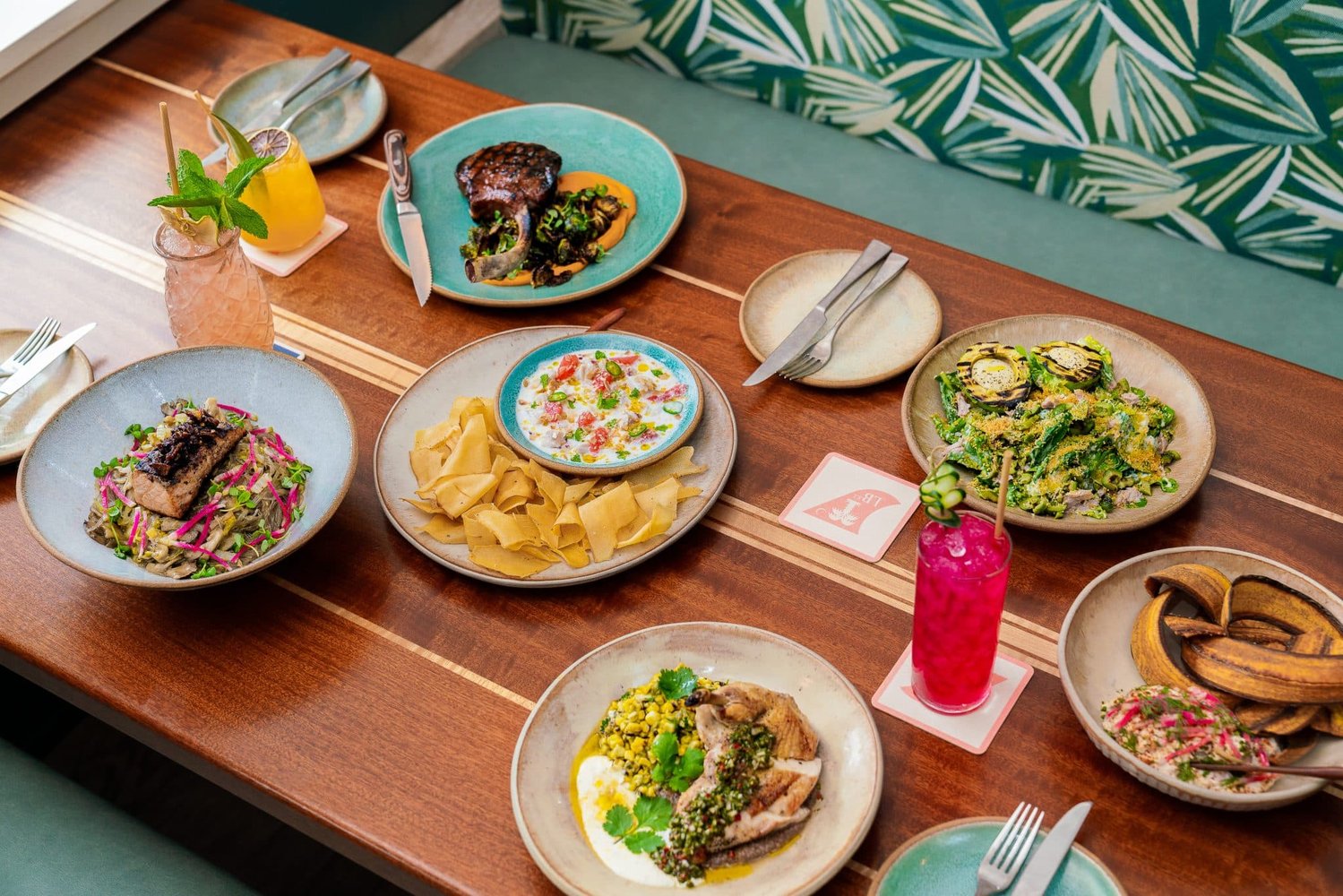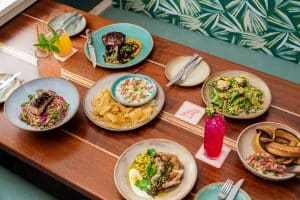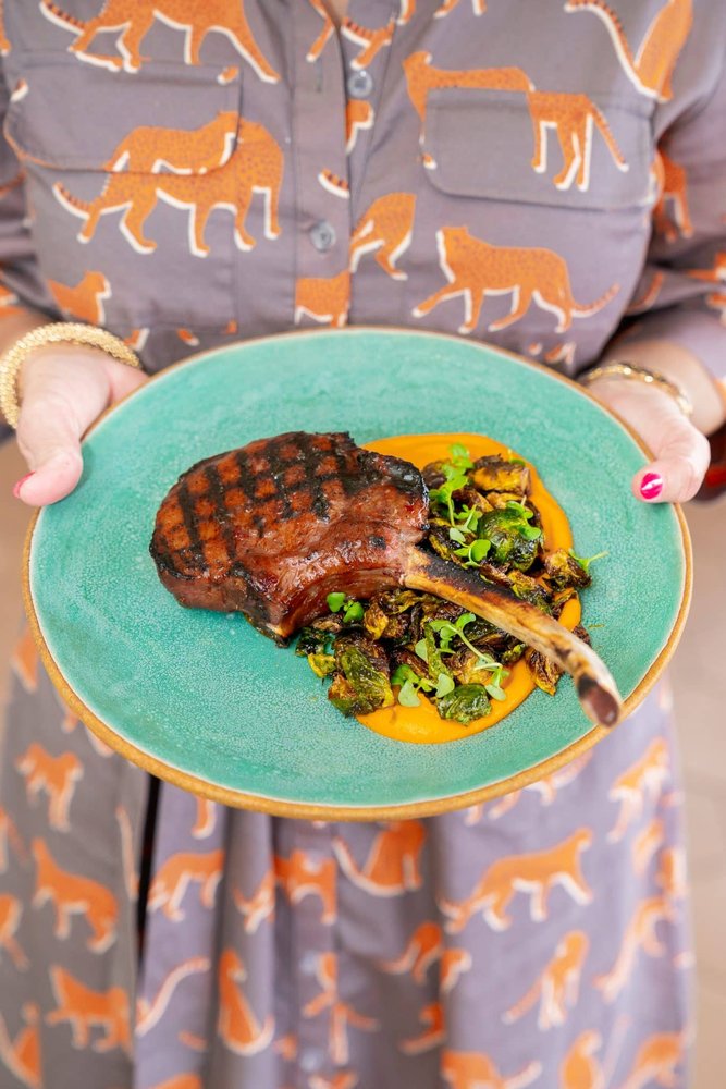Camp’s new menu includes dinner entrees like Picanha Steak with salsa verde, fingerling potatoes, and labneh; Grilled Salmon with vermicelli, wild mushrooms, radish, and chili crunch; Berkwood Farms Pork Chop (above right) with butterkin squash puree, brussels sprouts, and tamarind pineapple glaze; and Local Whole Fish with pozole rojo, corn, hominy, and avocado. Guests can choose from “Offshore” options, including shellfish and fish, and “Onshore” options, including poultry and meats.