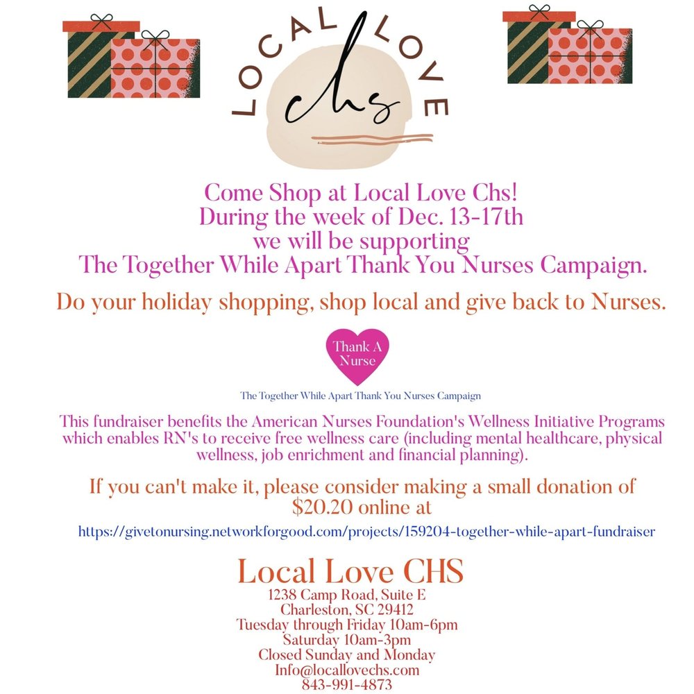 From Tuesday, December 13th to Saturday, December 17th, Local Love CHS will be supporting The Together While Apart Thank You Nurses Campaign. When you do your holiday shopping with the James Island business, you’ll be giving back to nurses!